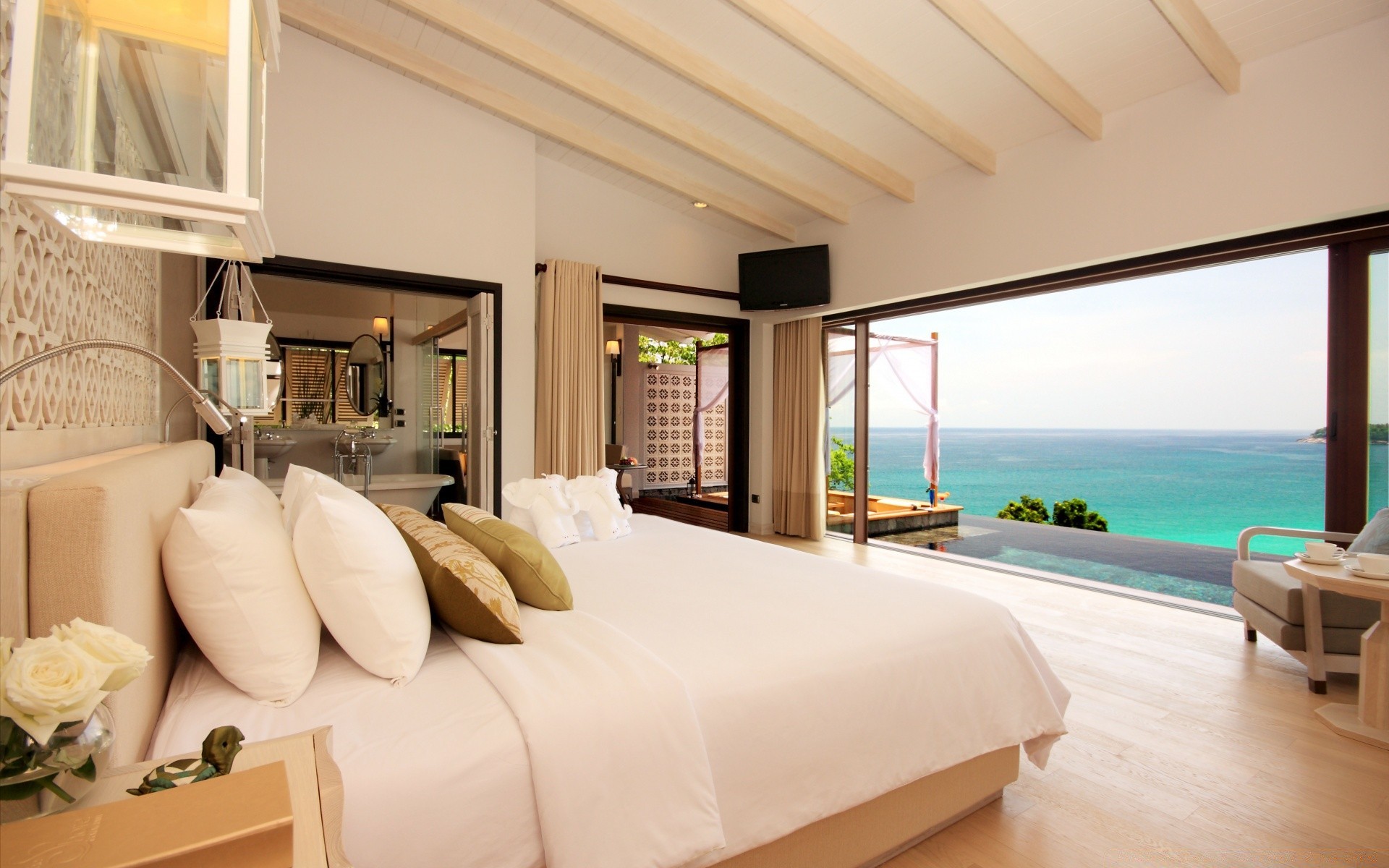 Nowoczesna sypialnia w tropikach z widokiem na ocean