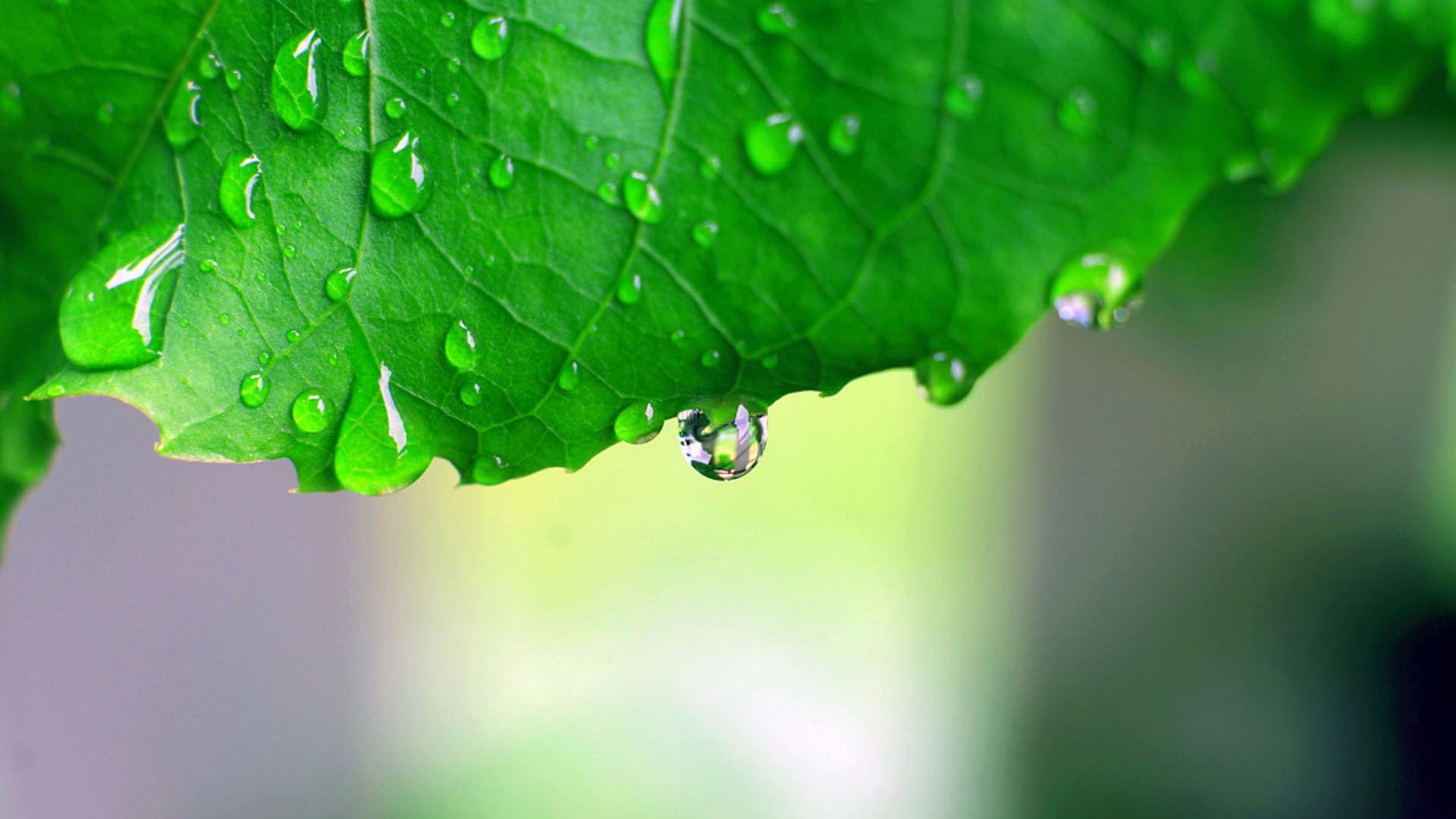Krople rosy na zielonych liściach