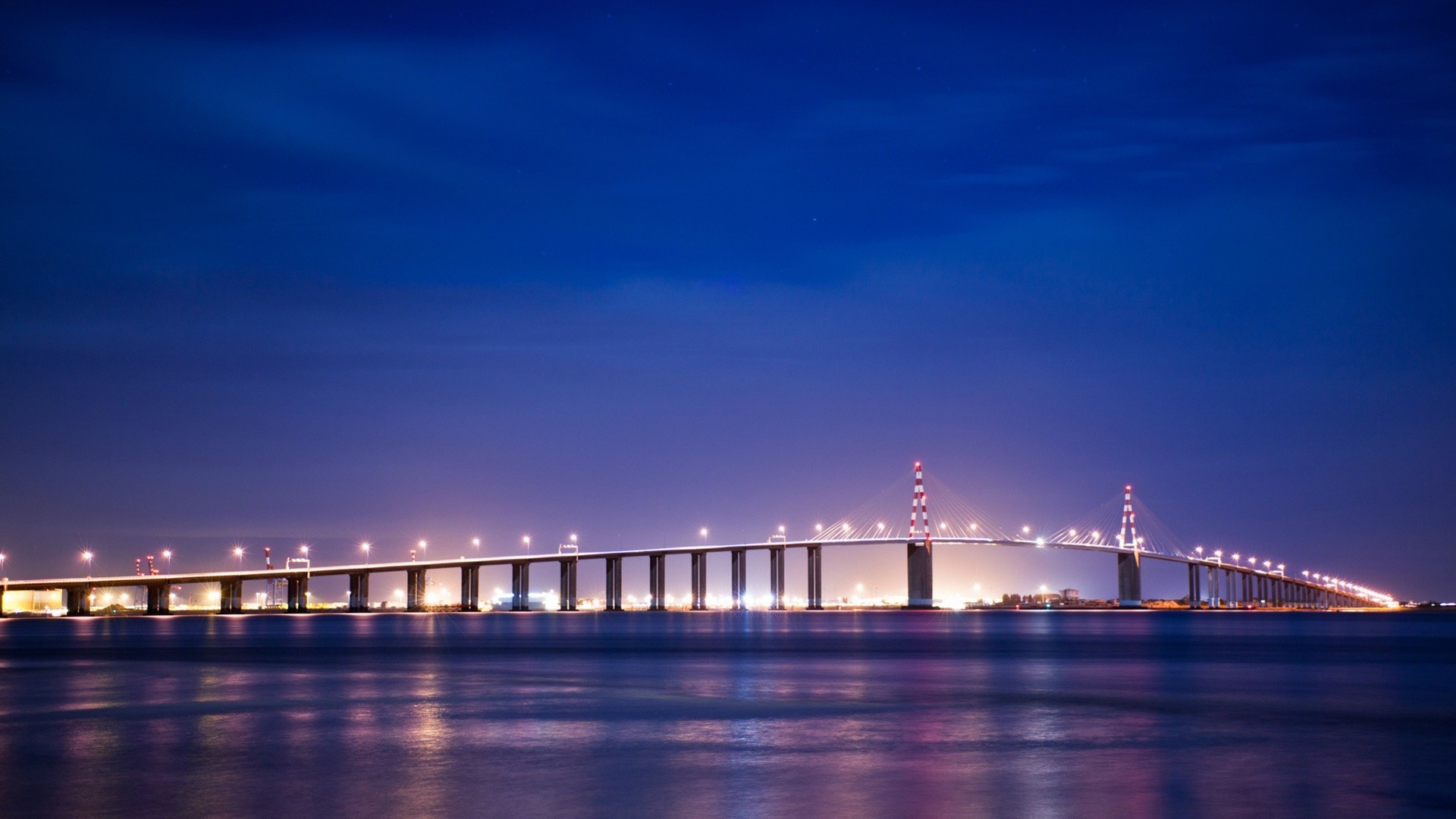 Krajobraz długiego mostu o zachodzie słońca nad powierzchnią wodyKrajobraz długiego mostu o zachodzie słońca nad powierzchnią wody