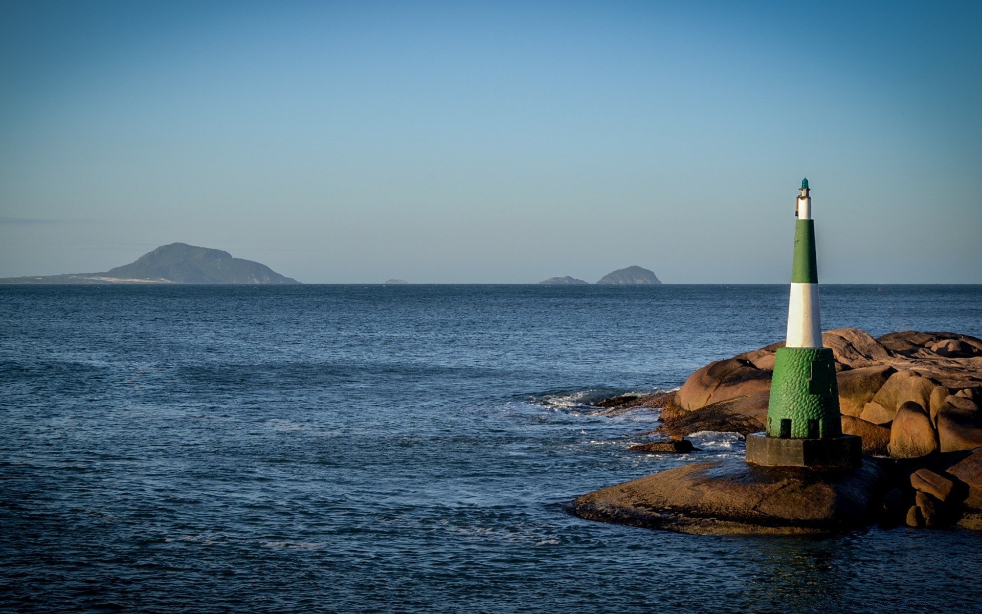 Latarnia morska w blasku zachodu słońca, wody zmierzchu