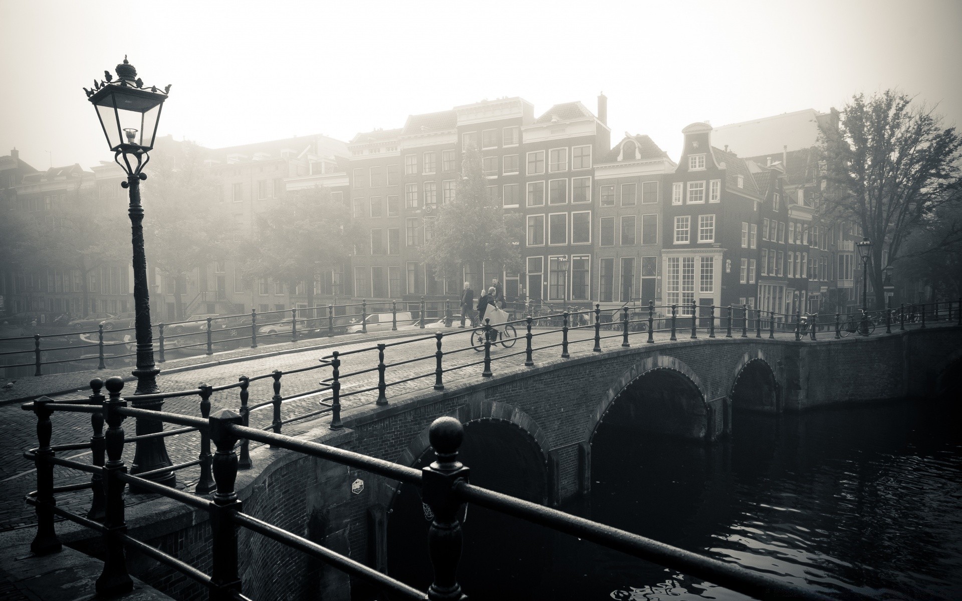 Most zanurzony w gęstej mgle o zachodzie słońca