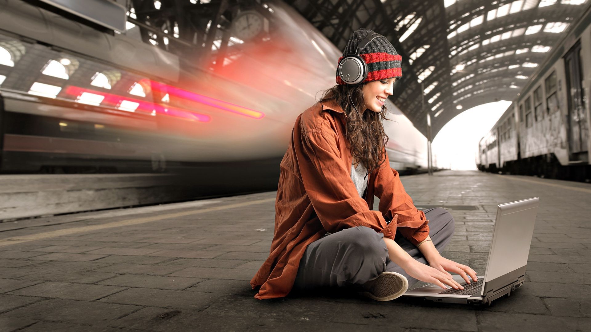 Dziewczyna w słuchawkach siedzi przy laptopie