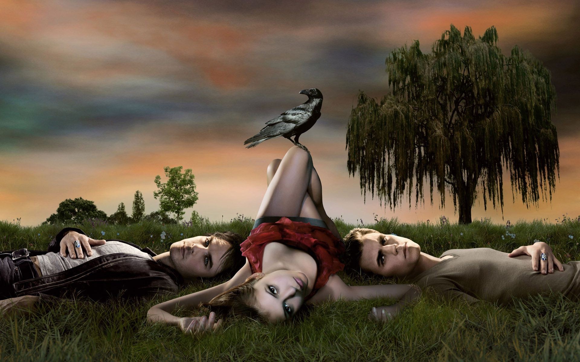 Wampir wilkołak i dziewczyna leżą na polu na tle drzewa o zachodzie słońca