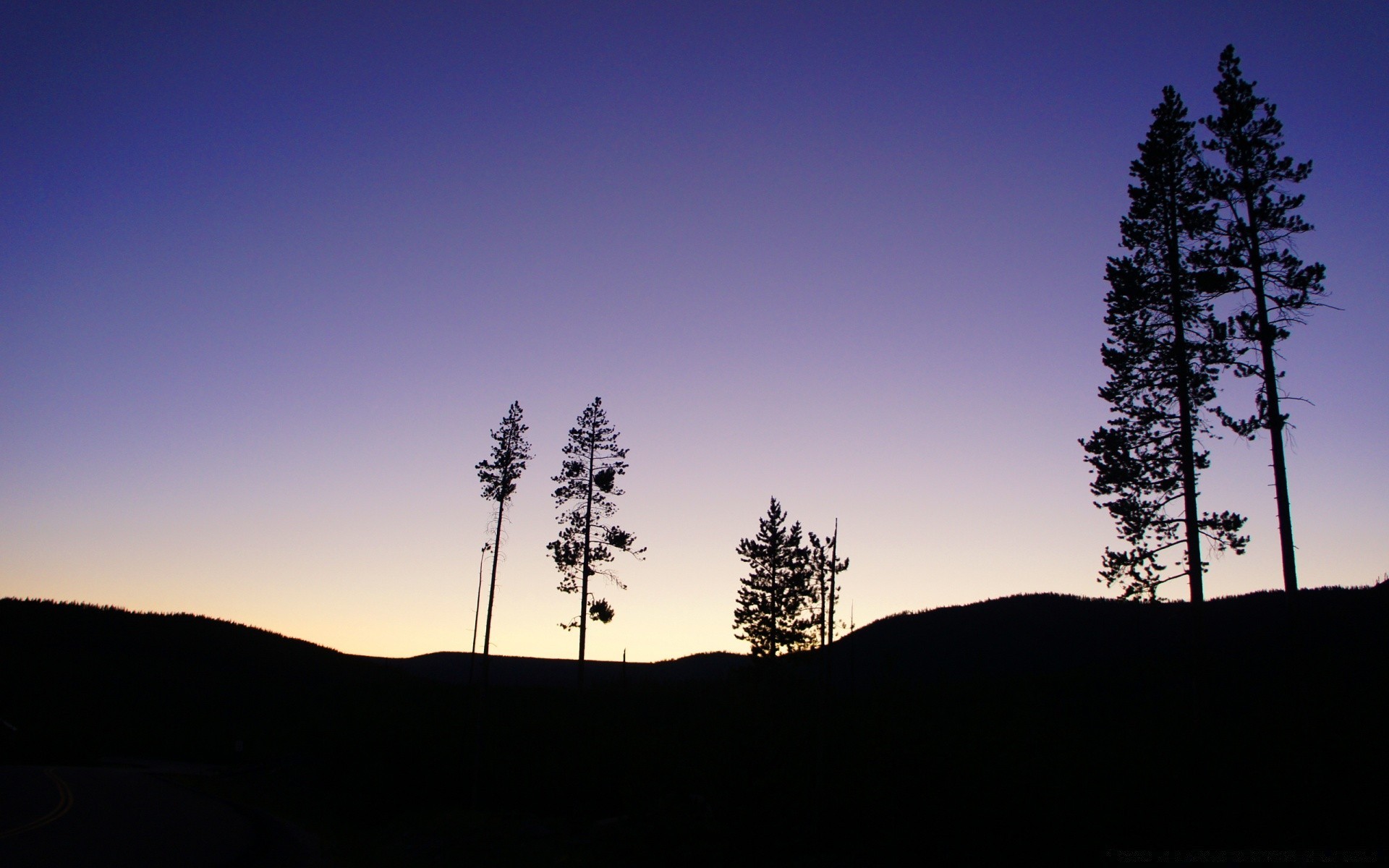 Sylwetki drzew na tle nieba o zachodzie słońca