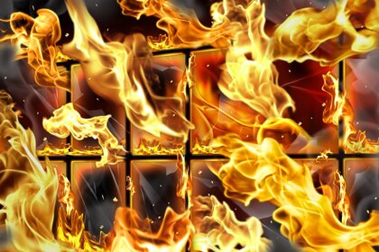 Na zdjęciu wojskowym czołg porusza się w dymie wśród ognistych płomieniNa zdjęciu wojskowym czołg porusza się w dymie wśród ognistych płomieni