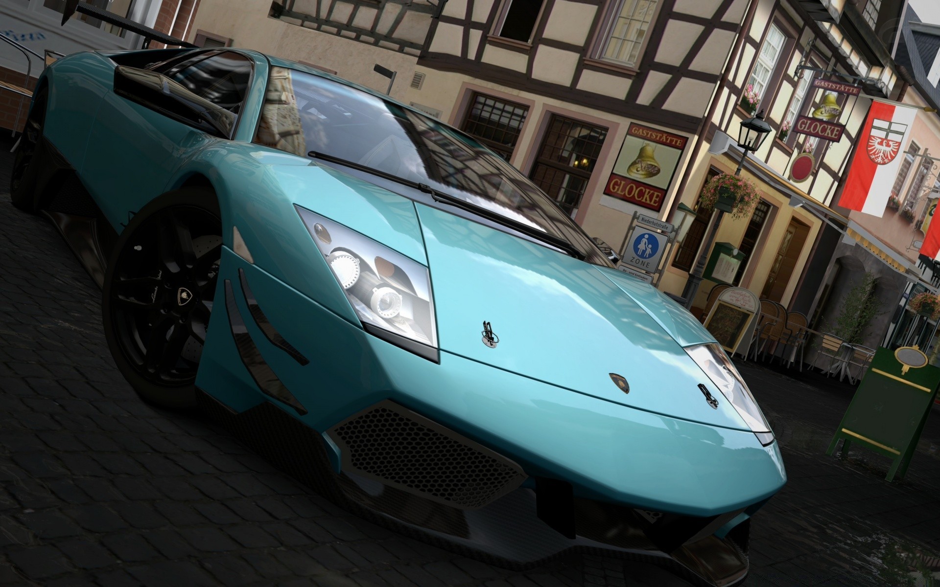 Niebieski samochód w mieście w grze komputerowej gran turismo
