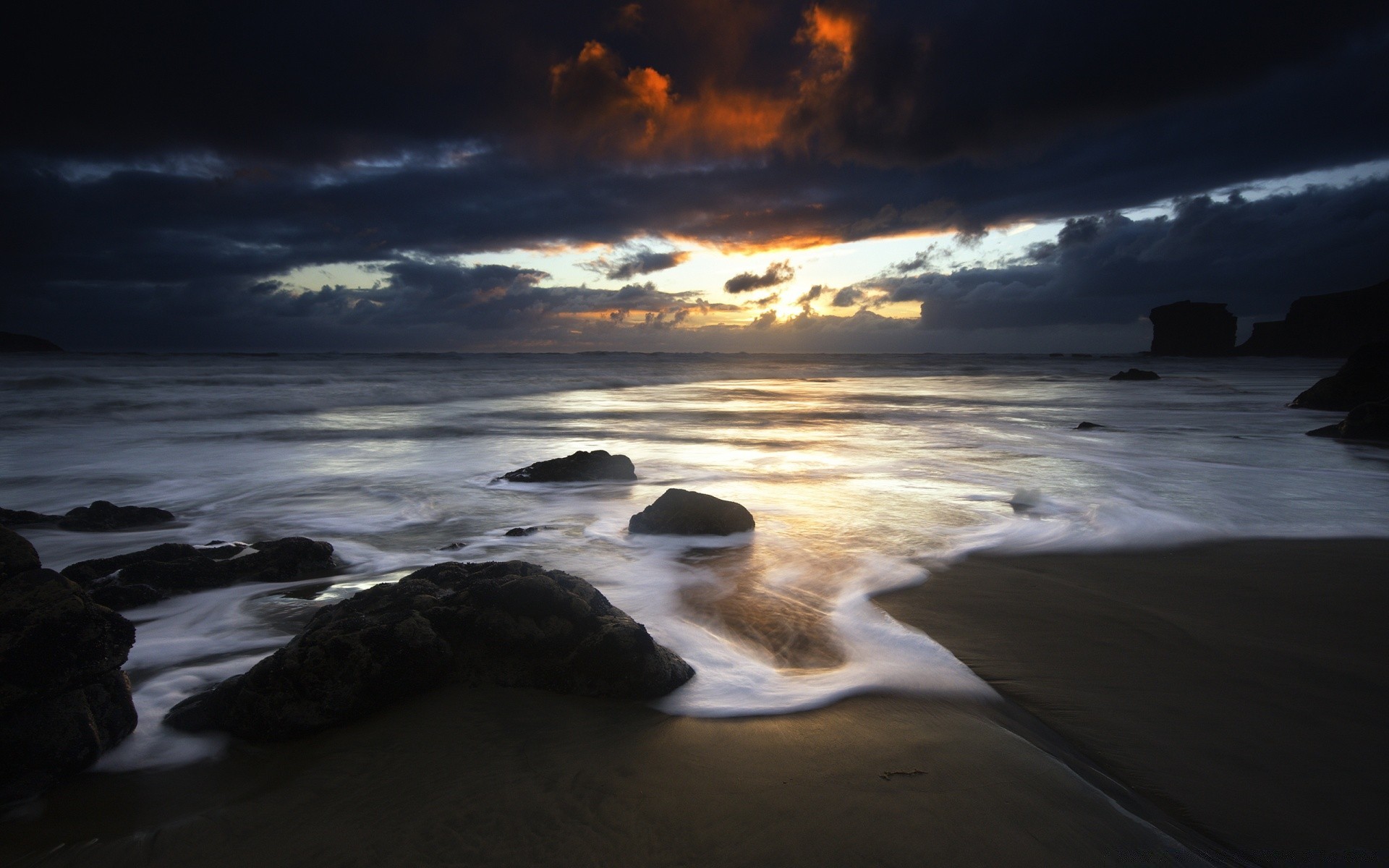 Karmazynowy Zachód słońca przez chmury nad oceanem