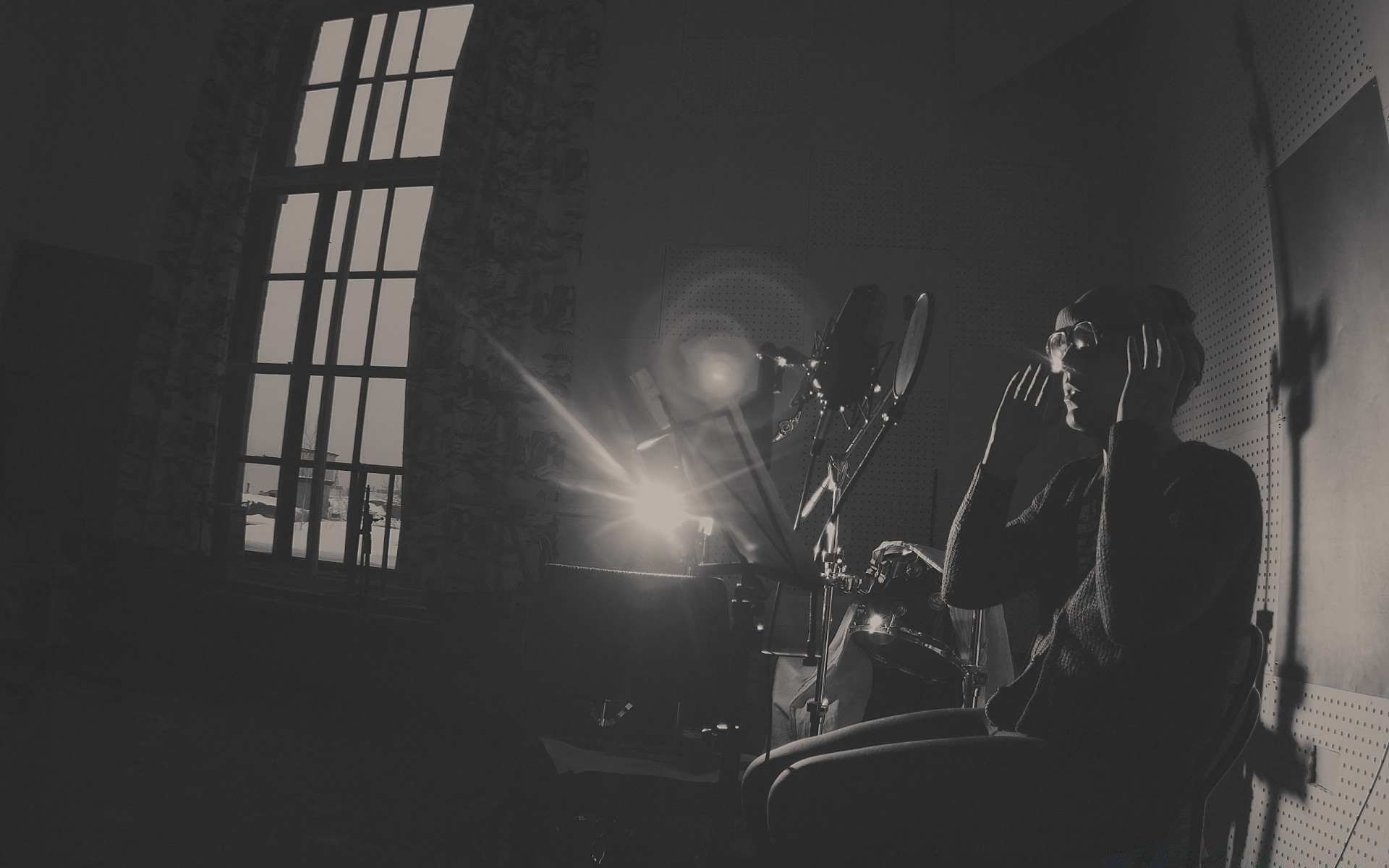 Nagranie fonogramu przez mężczyznę w okularach czarno-białe