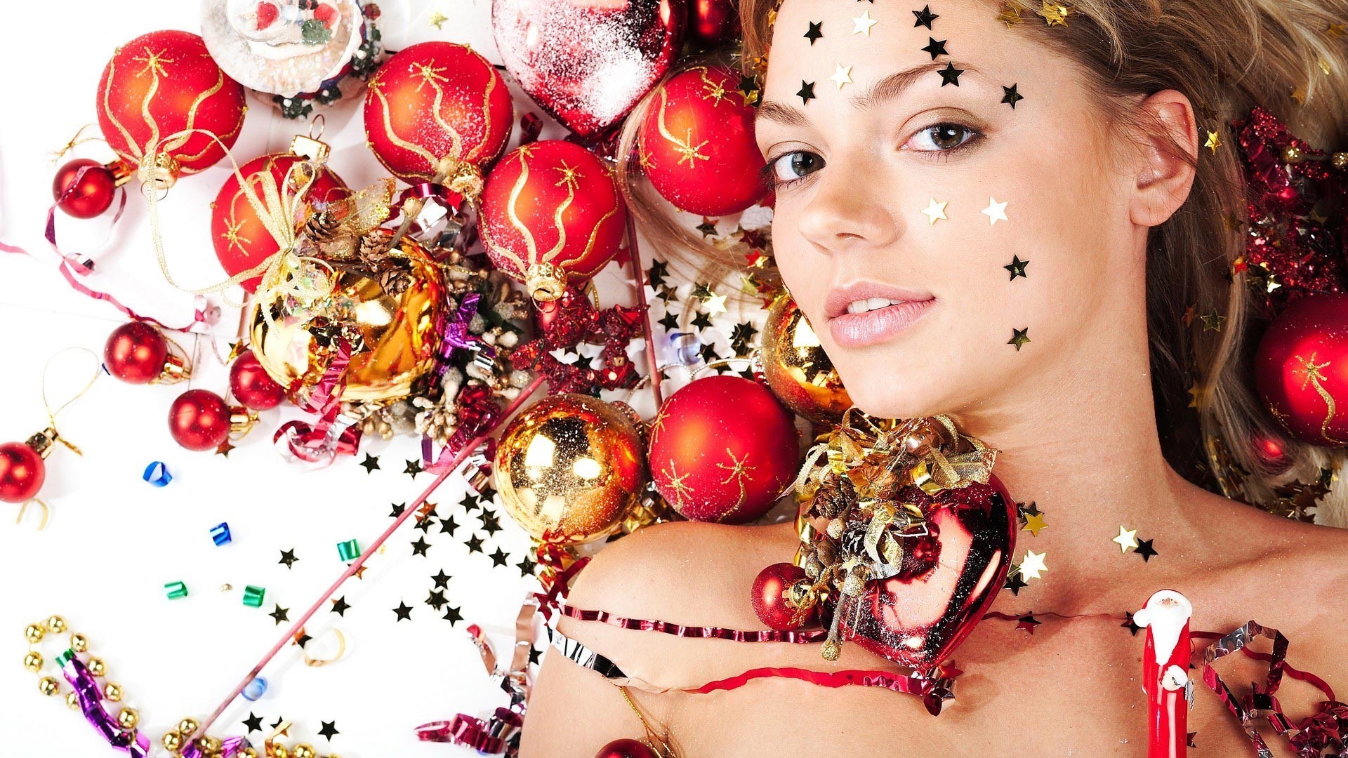 Dziewczyna ozdobiona gwiazdami i zabawkami choinkowymi