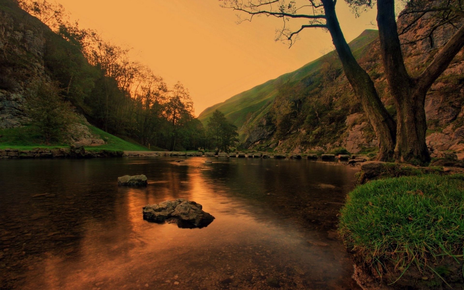 Jezioro o zachodzie słońca i wokół wysokie góry
