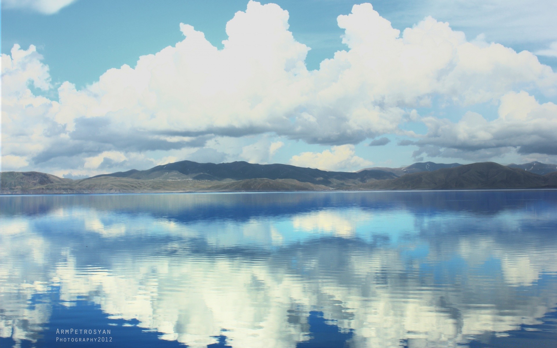 Odbicie chmur cumulus w jeziorze