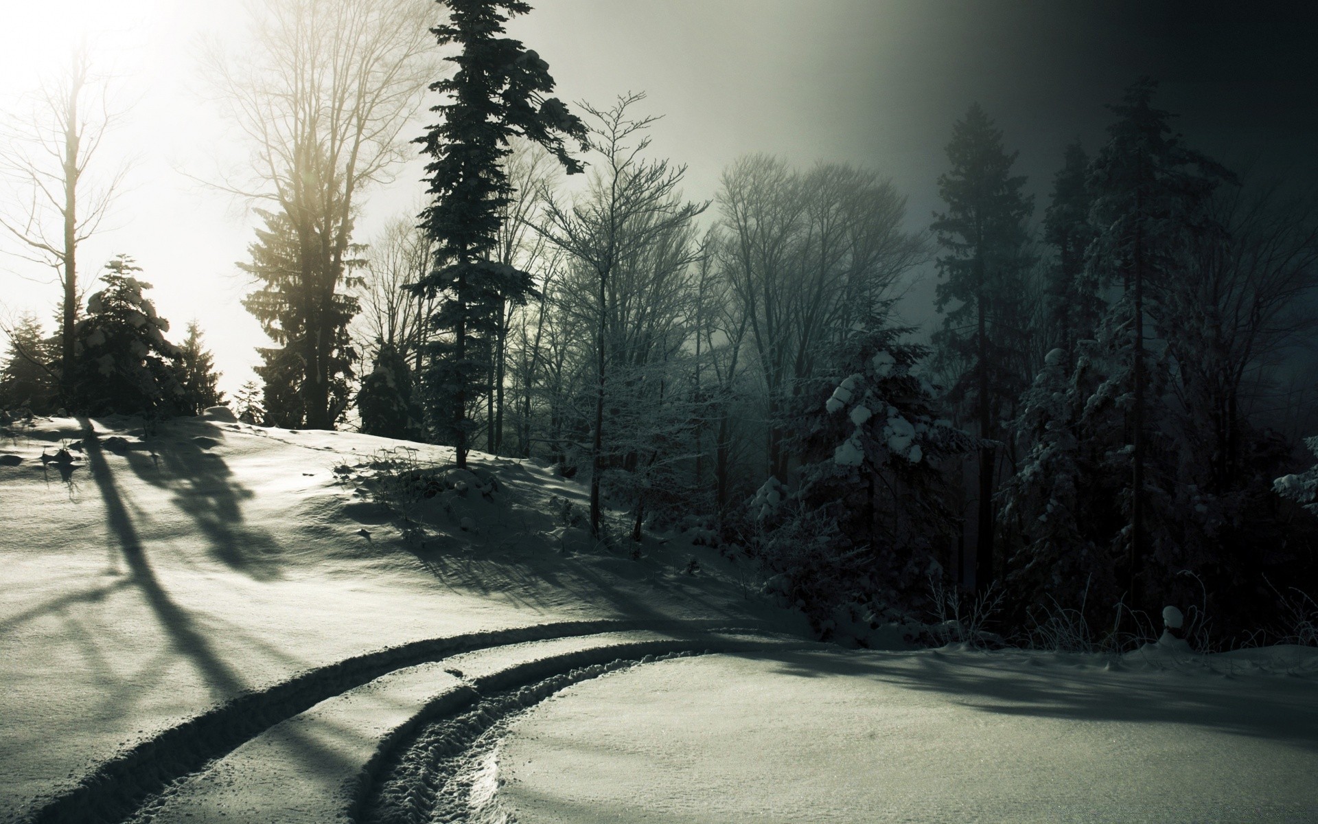Ślady po samochodach w mrocznym lesie zimą