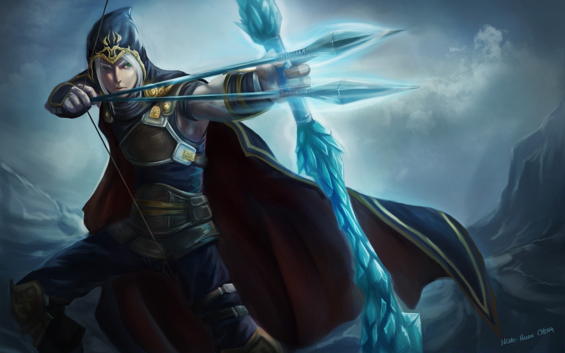 Superbohater w pelerynie z kapturem strzela z łuku pod wodą