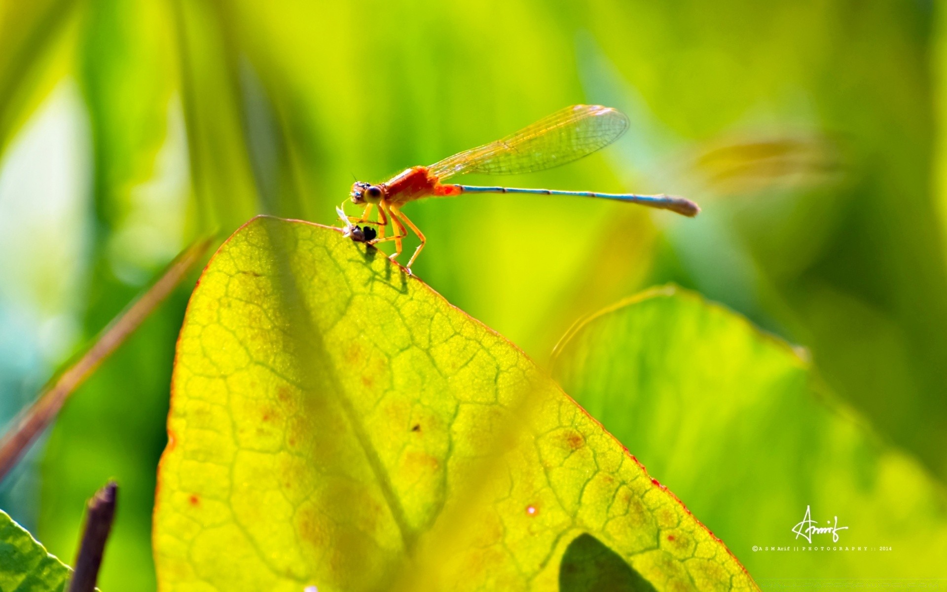 Ważka spoczywa na krawędzi liścia