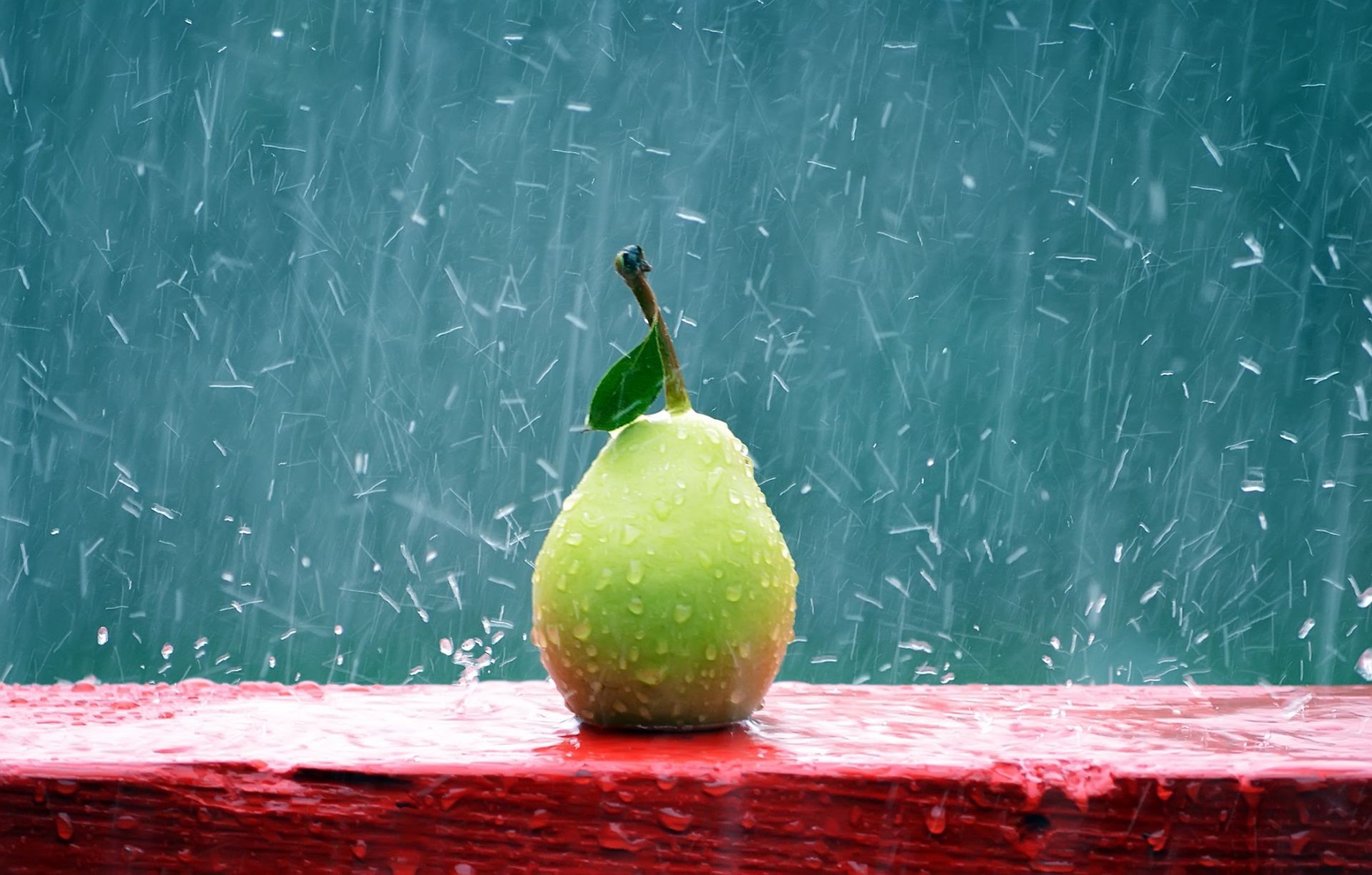 Samotna gruszka w ulewnym deszczu