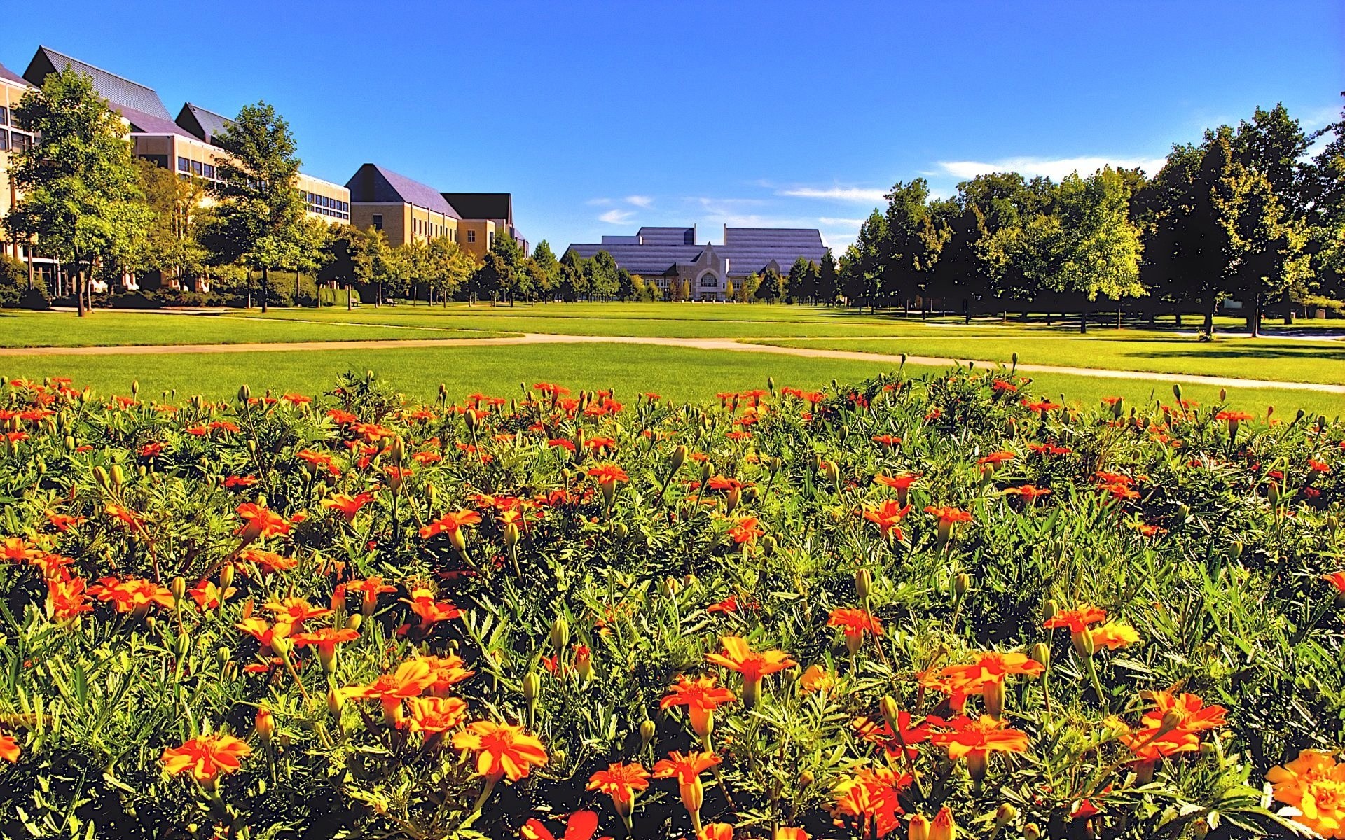 Czerwone kwiaty na tle wsi