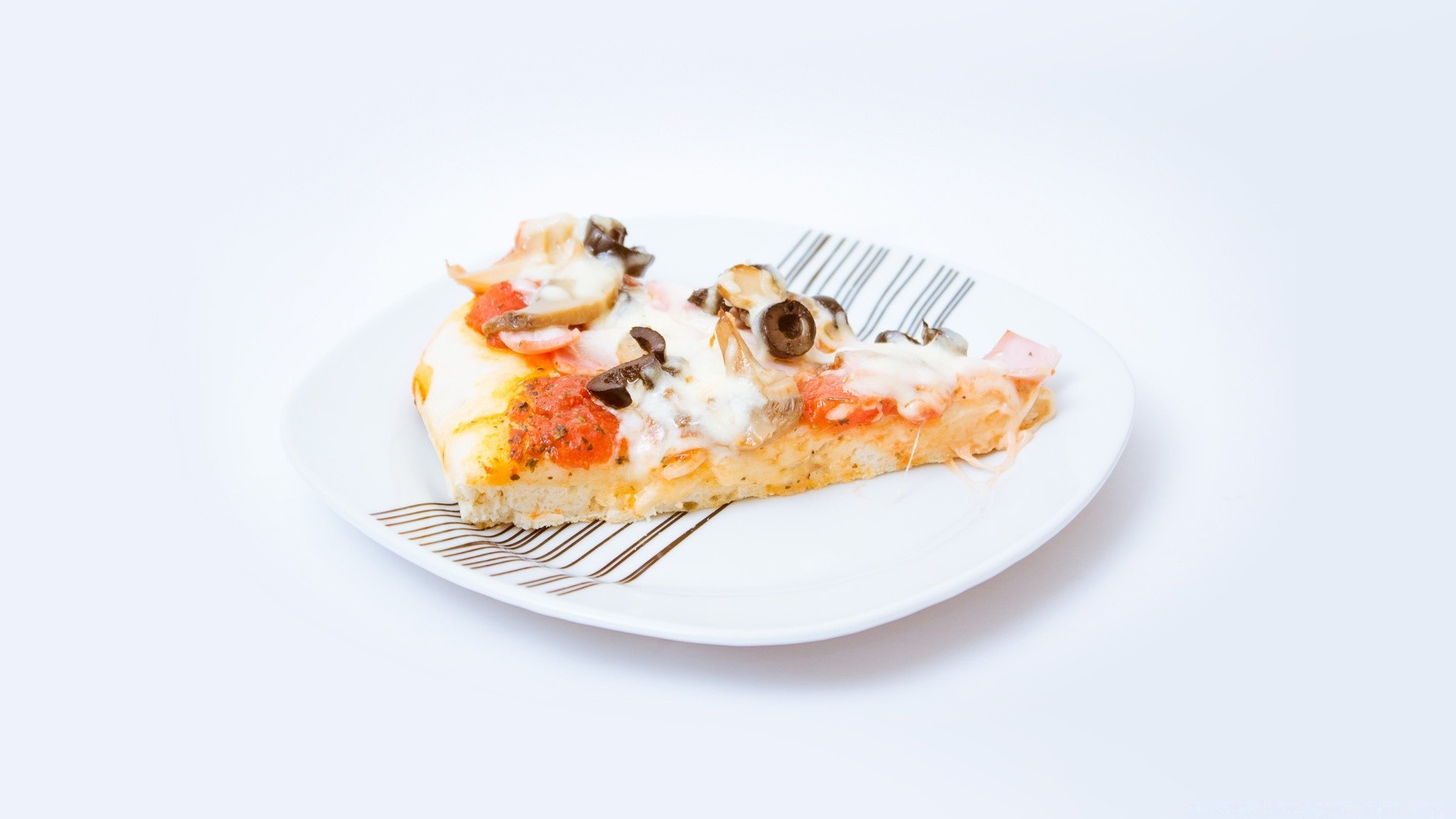 Kawałek pizzy z kurczakiem i grzybami na białym talerzu w czarne paski