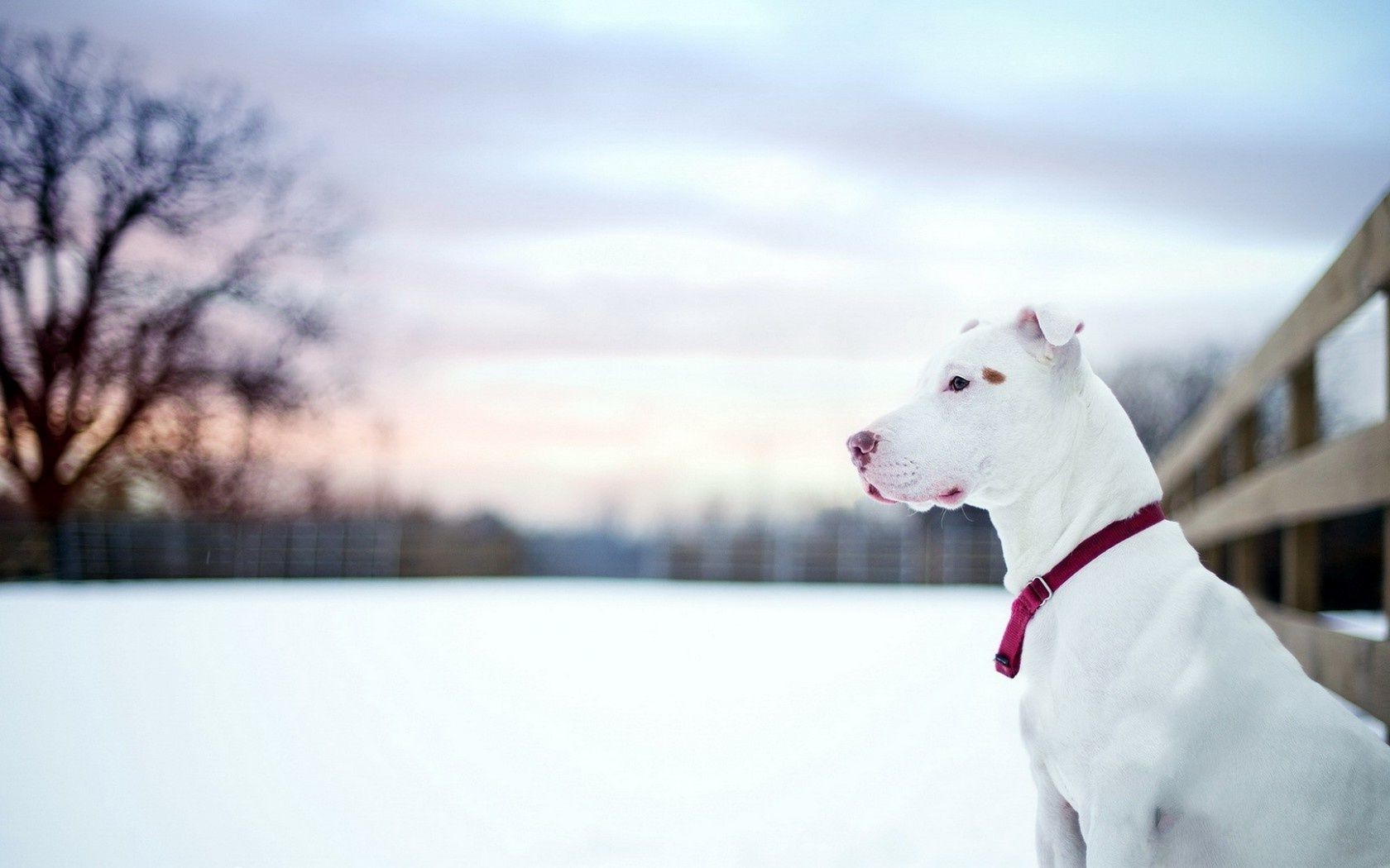 Śnieżnobiały pies na tle śniegu