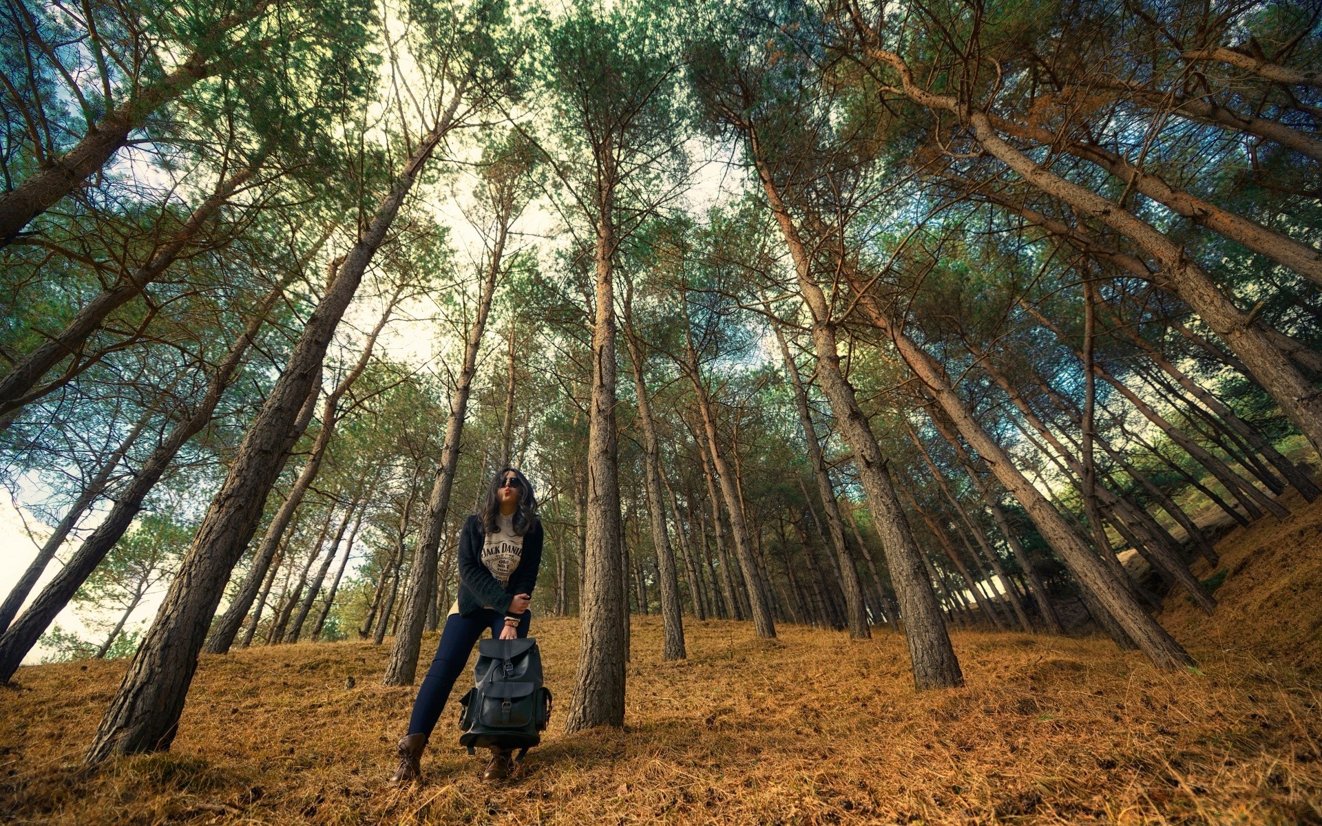 Dziewczyna podróżnik na tle lasu