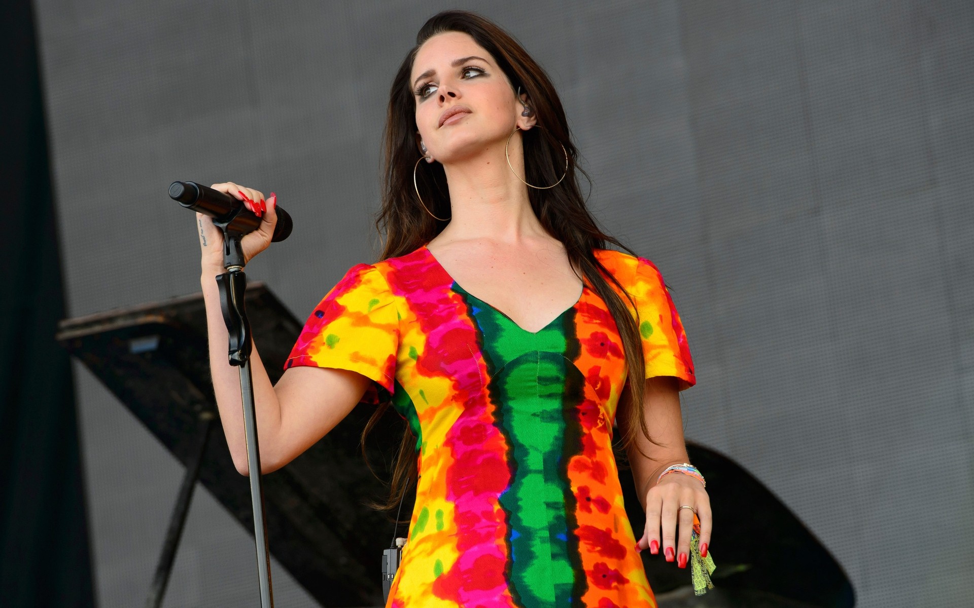 Ciemnowłosa piosenkarka w jasnej sukience na scenie z mikrofonem w dłoni
