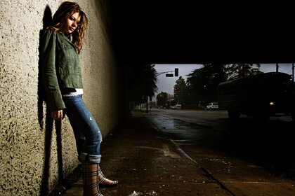 Dziewczyna w gumowych butach na nocnym parkingu