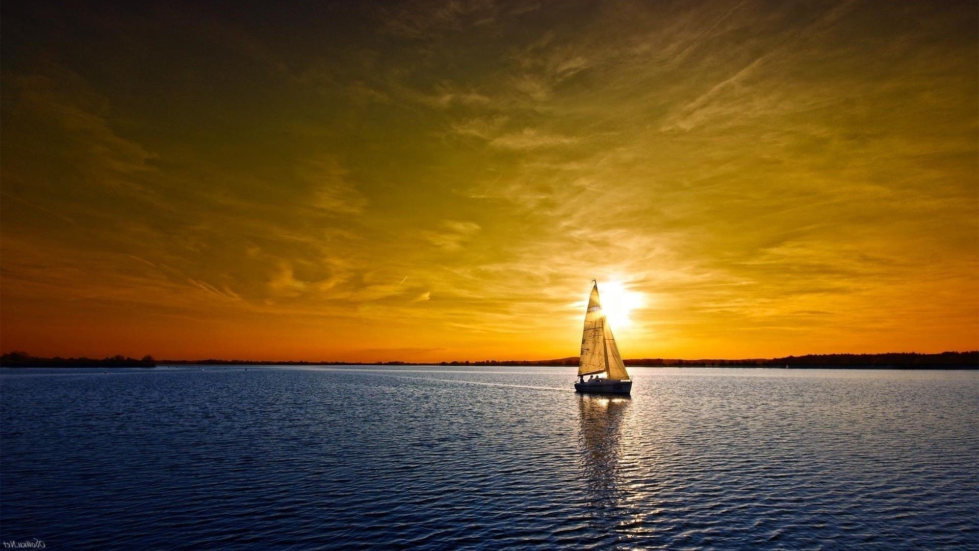 Jacht na cichej powierzchni wody. Zachód słońca, wieczór