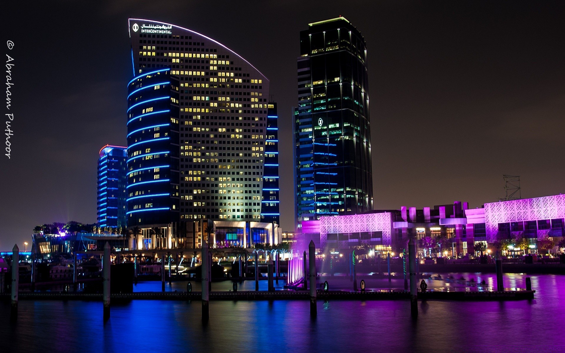Rzeka pośrodku parku miejskiego na tle drapaczy chmur