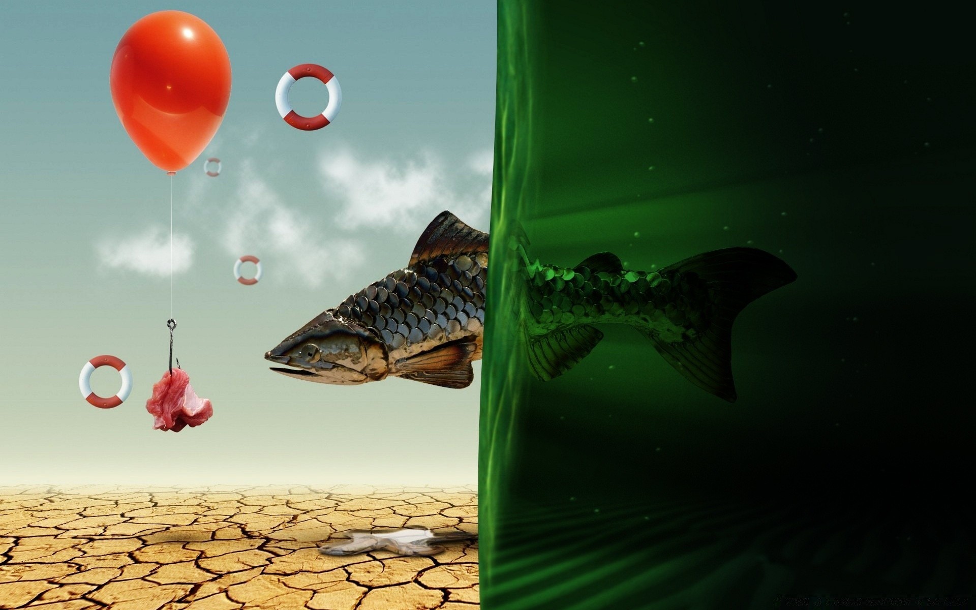 Kreatywny obraz z rybą i czerwoną kulką