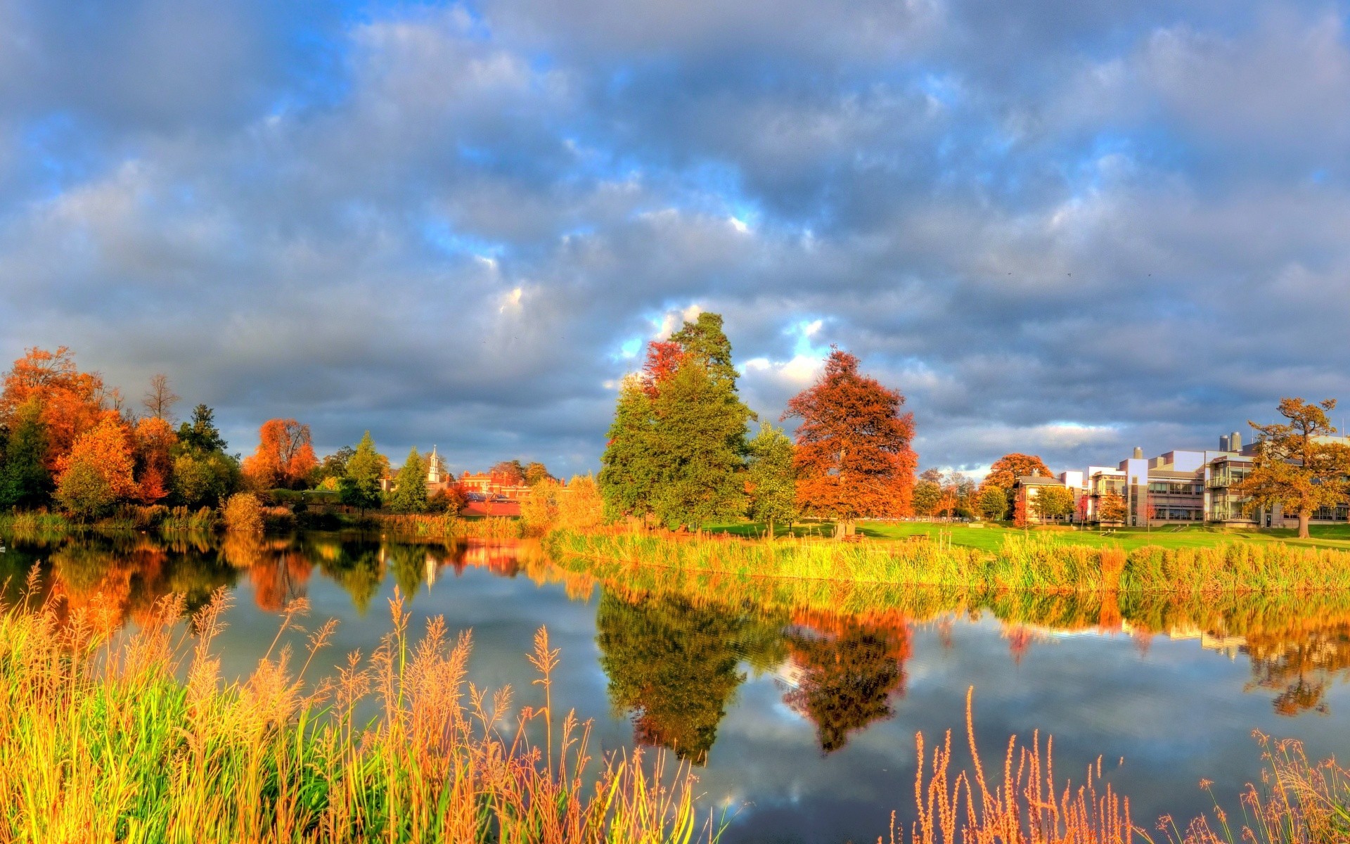 Jesienny krajobraz kolorowych drzew odbijających się w powierzchni rzeki