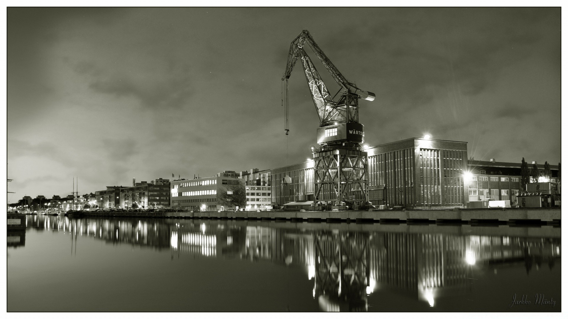 Rzeka. Zabudowa miejska. Dźwigi morskie