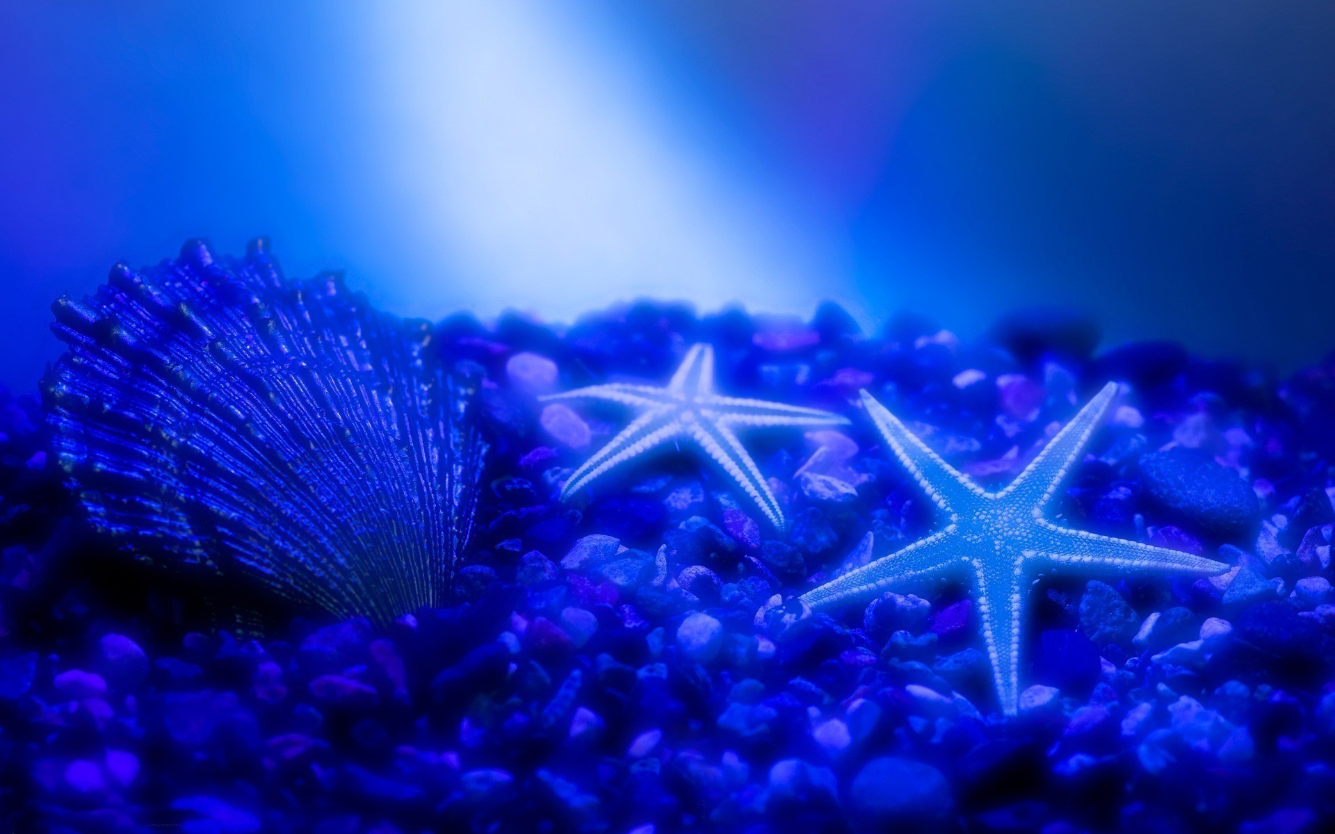 Dwie rozgwiazdy i muszla na dnie oceanu