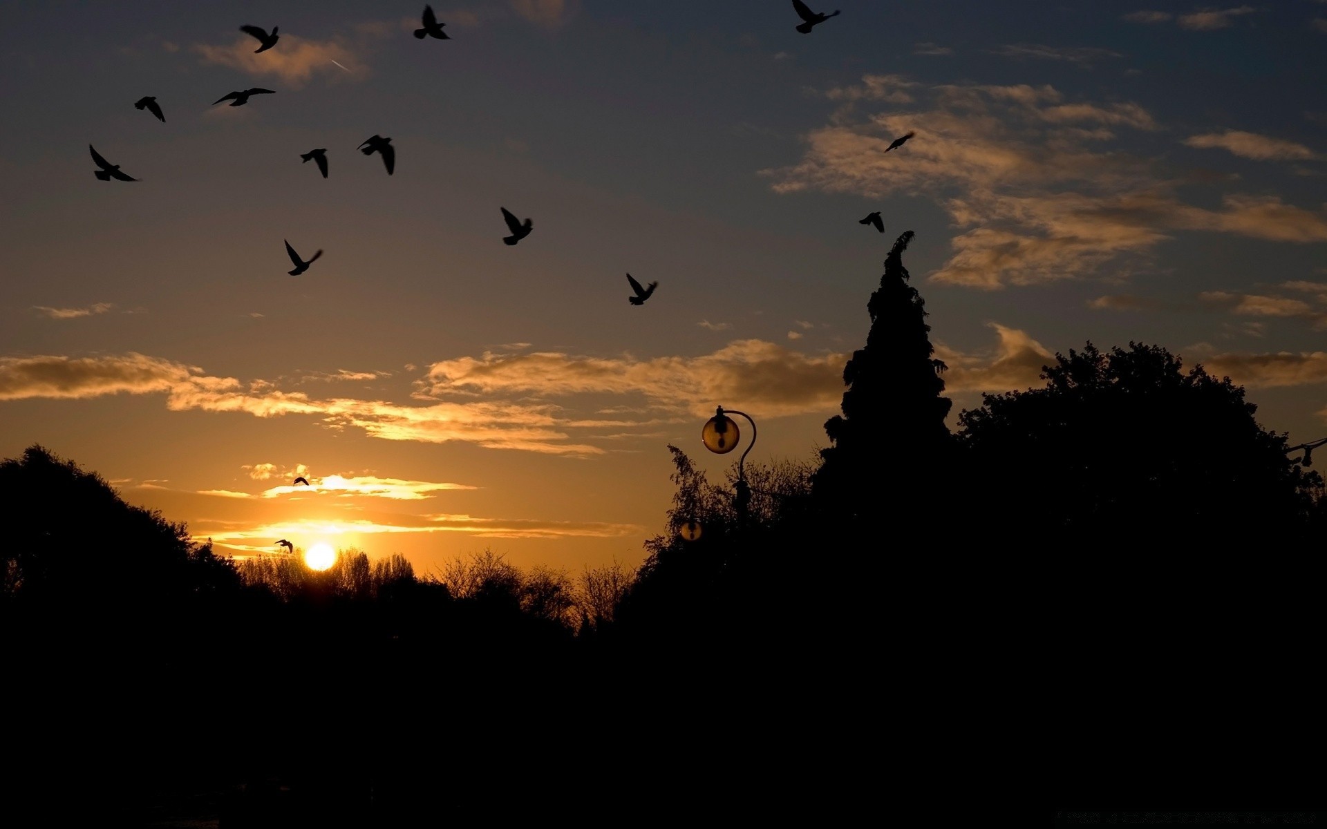 Sylwetki ptaków na tle zachodu Słońca
