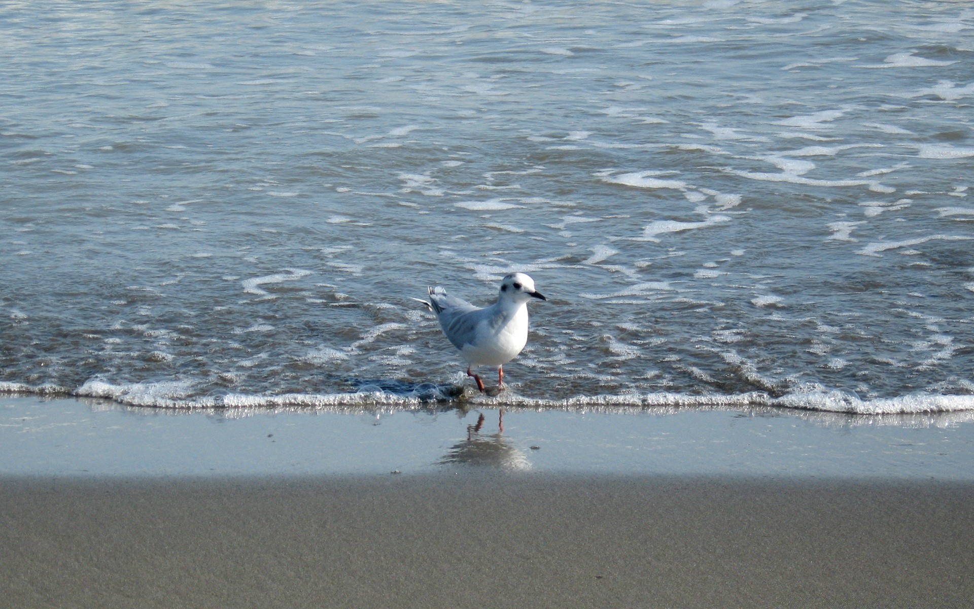 Mewa idzie brzegiem morza