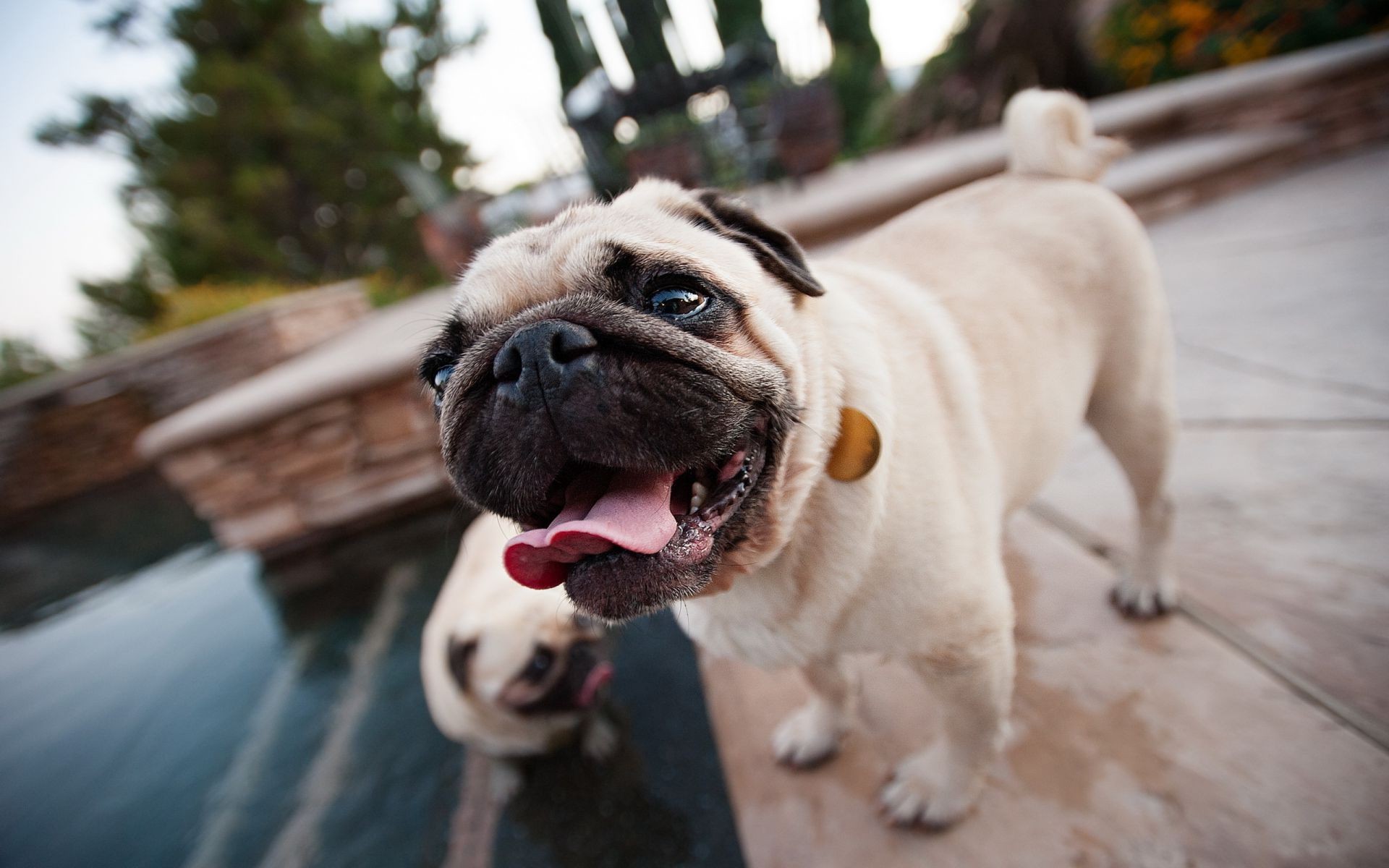 Biały mops nad jeziorem