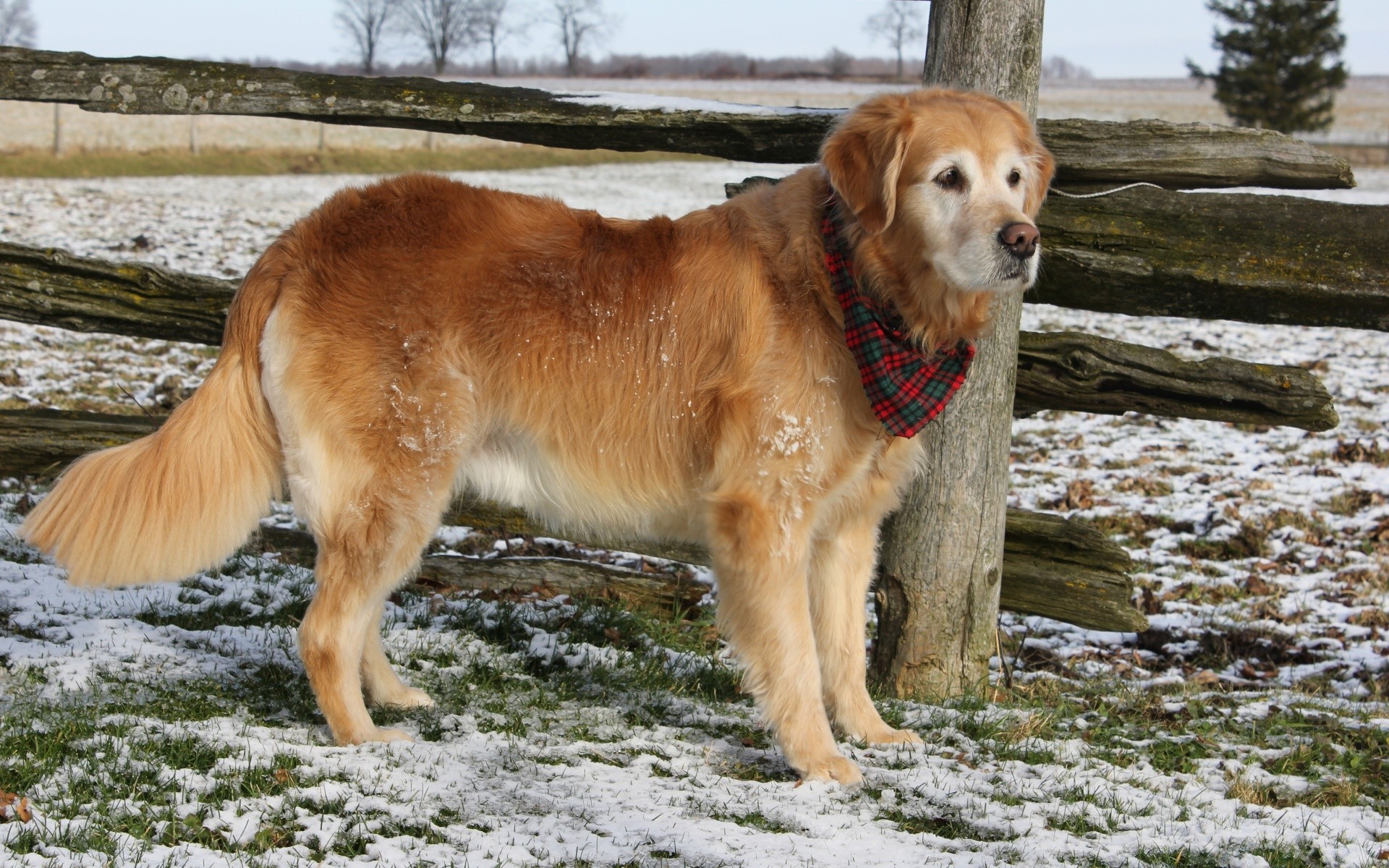 Pies na zimowym polu z szalikiem