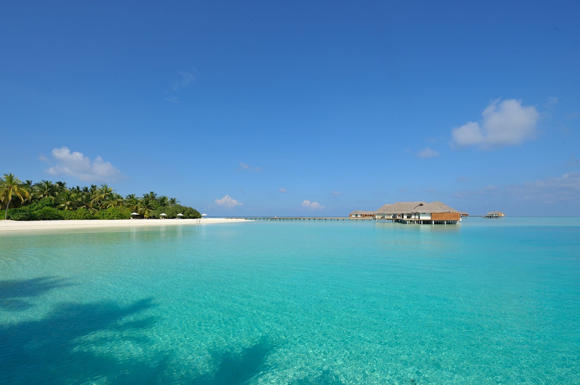 Śnieżnobiała Latarnia morska na błękitnym niebie nad wodą