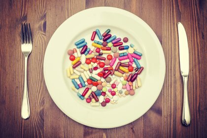 HLS kolorowe tabletki na talerzu widelec nóż