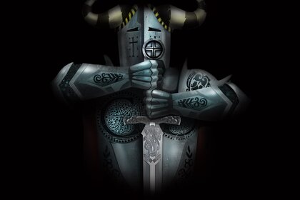 Szary robot z mieczem i rogami