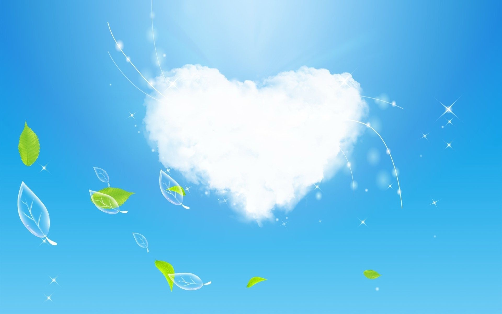 Ilustracja serca z chmur na niebie wśród liści drzewIlustracja serca z chmur na niebie wśród liści drzew