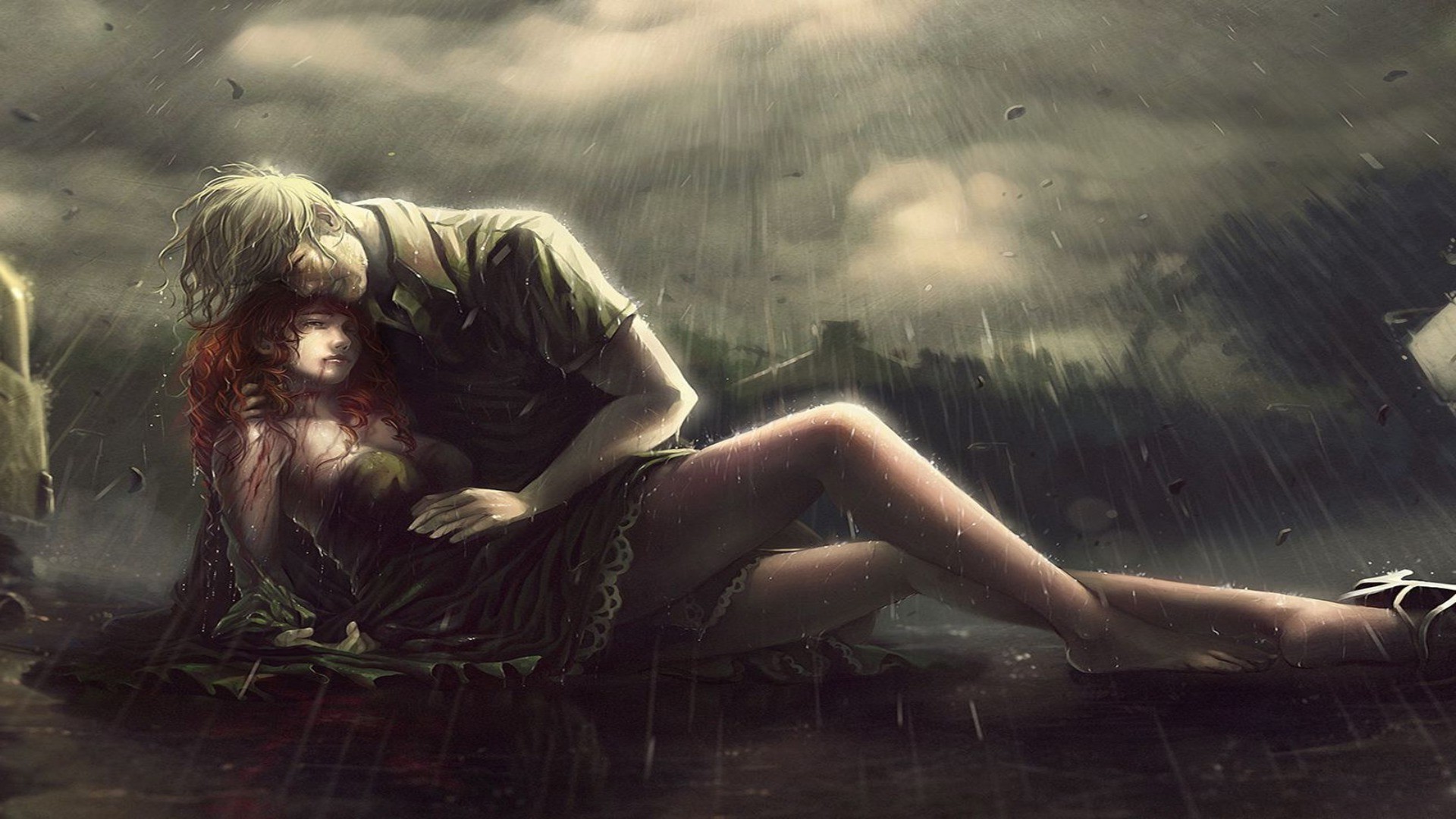 Dziewczyna umierająca w ramionach faceta, pół deszczem