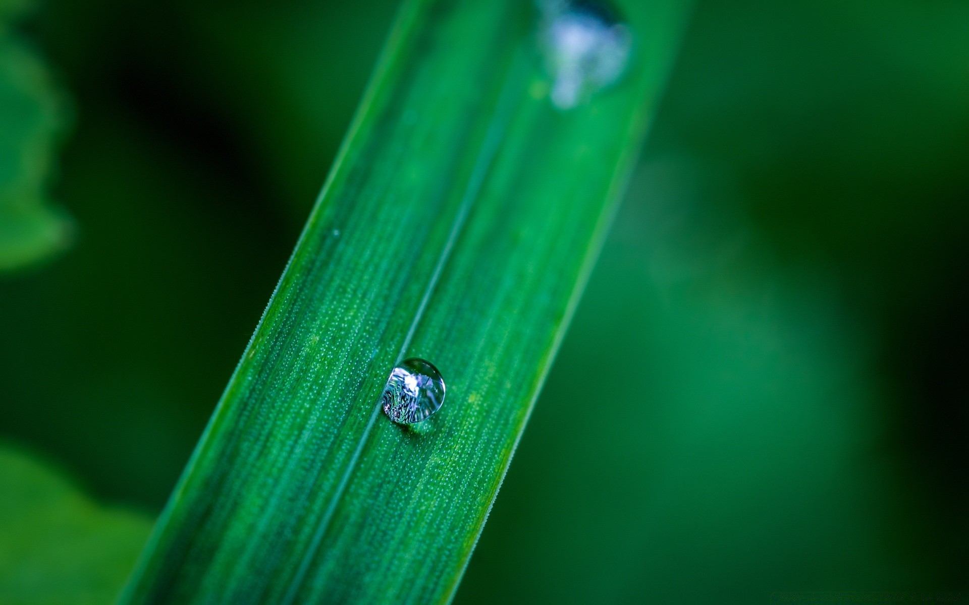 Makro zielone źdźbło trawy ozdobione kropelkami rosy