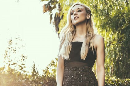 Kobieta model pozuje pod zachodzące promienie słońca