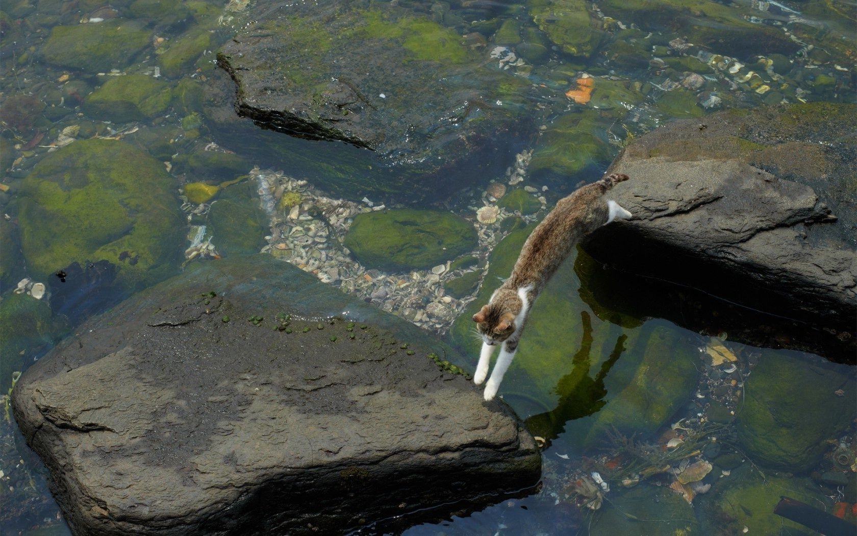 Kot podróżnik spaceruje po skałach na rzece