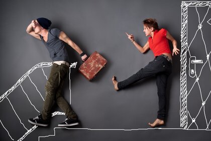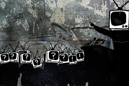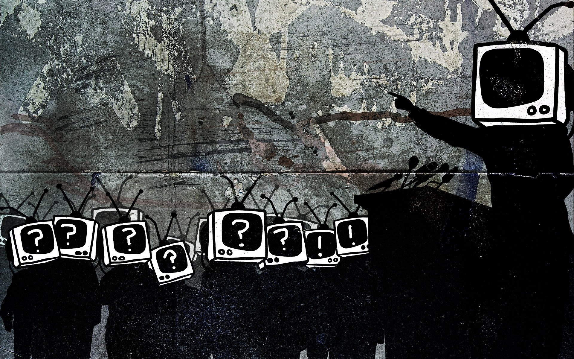 Graffiti na szarej betonowej ścianie przedstawiające ludzi z telewizorami zamiast głów