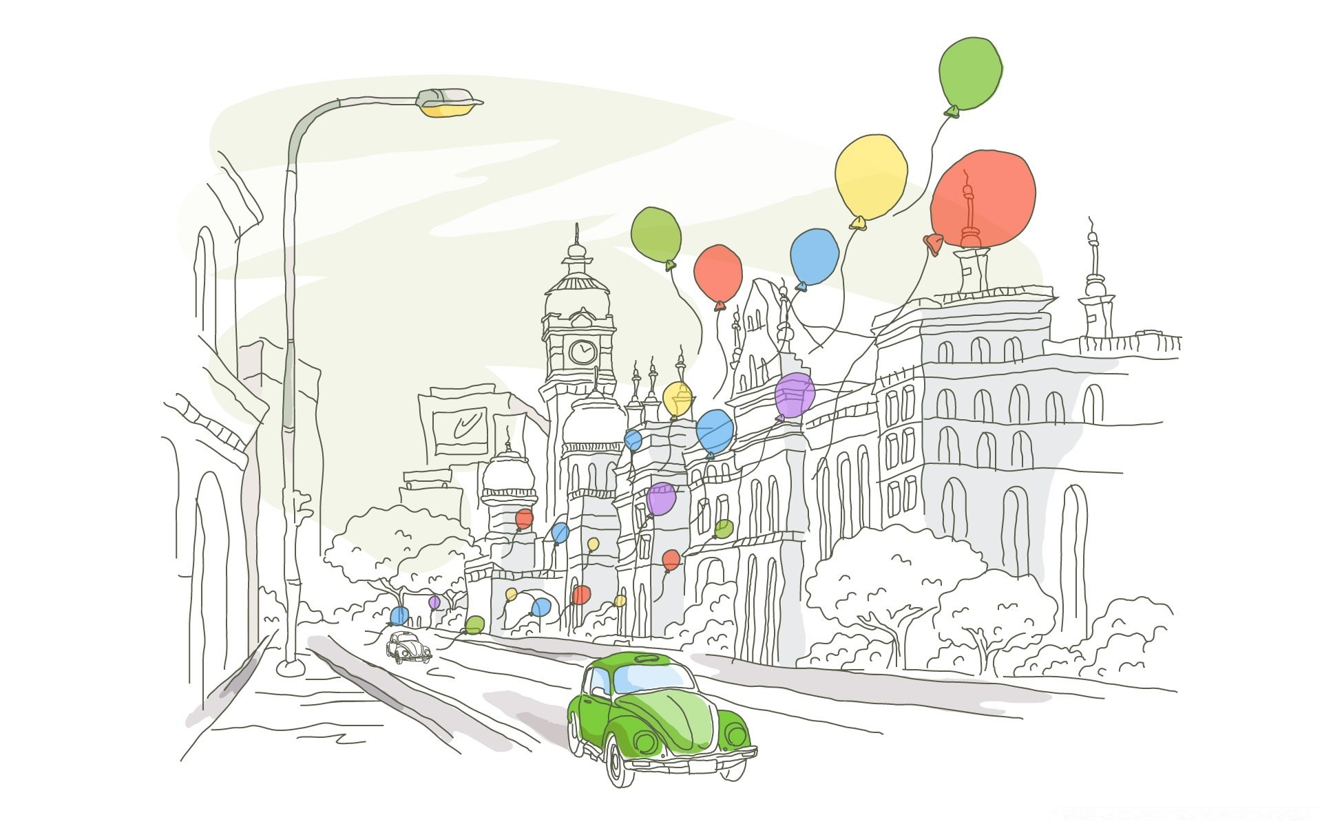 Rysunek Zielonego samochodu i balonów na ulicy miejskiej