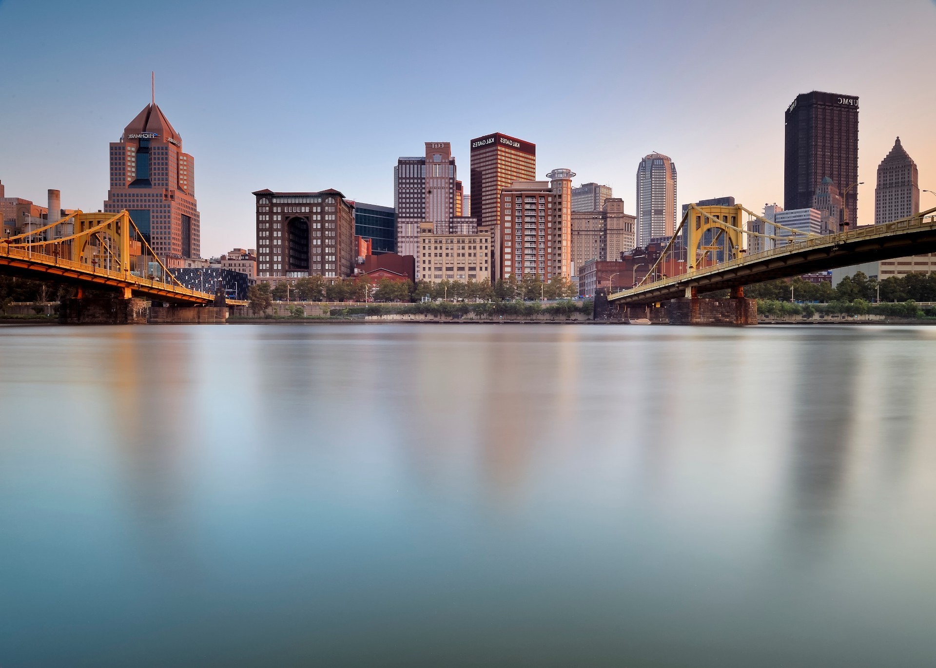 Jasne Wieczorne miasto nad wodą. Z eleganckimi budynkami