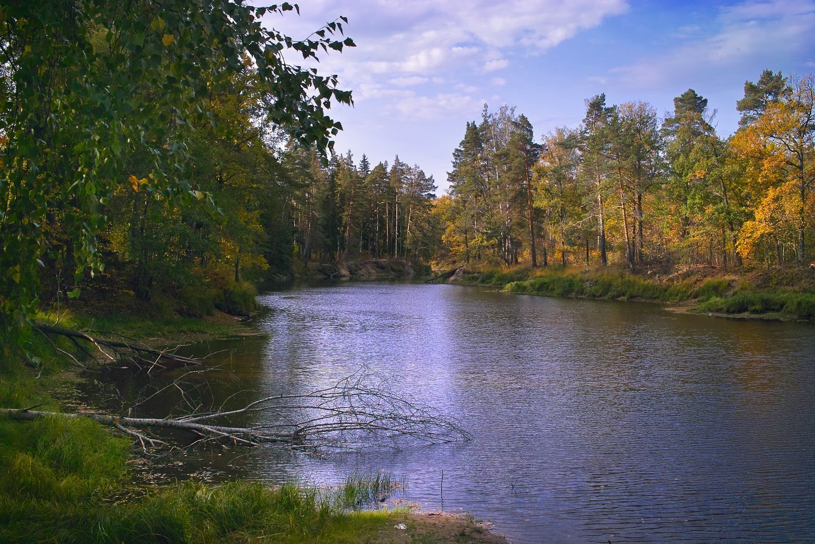 Rzeka z pochmurnym niebem i lasem wzdłuż brzegów