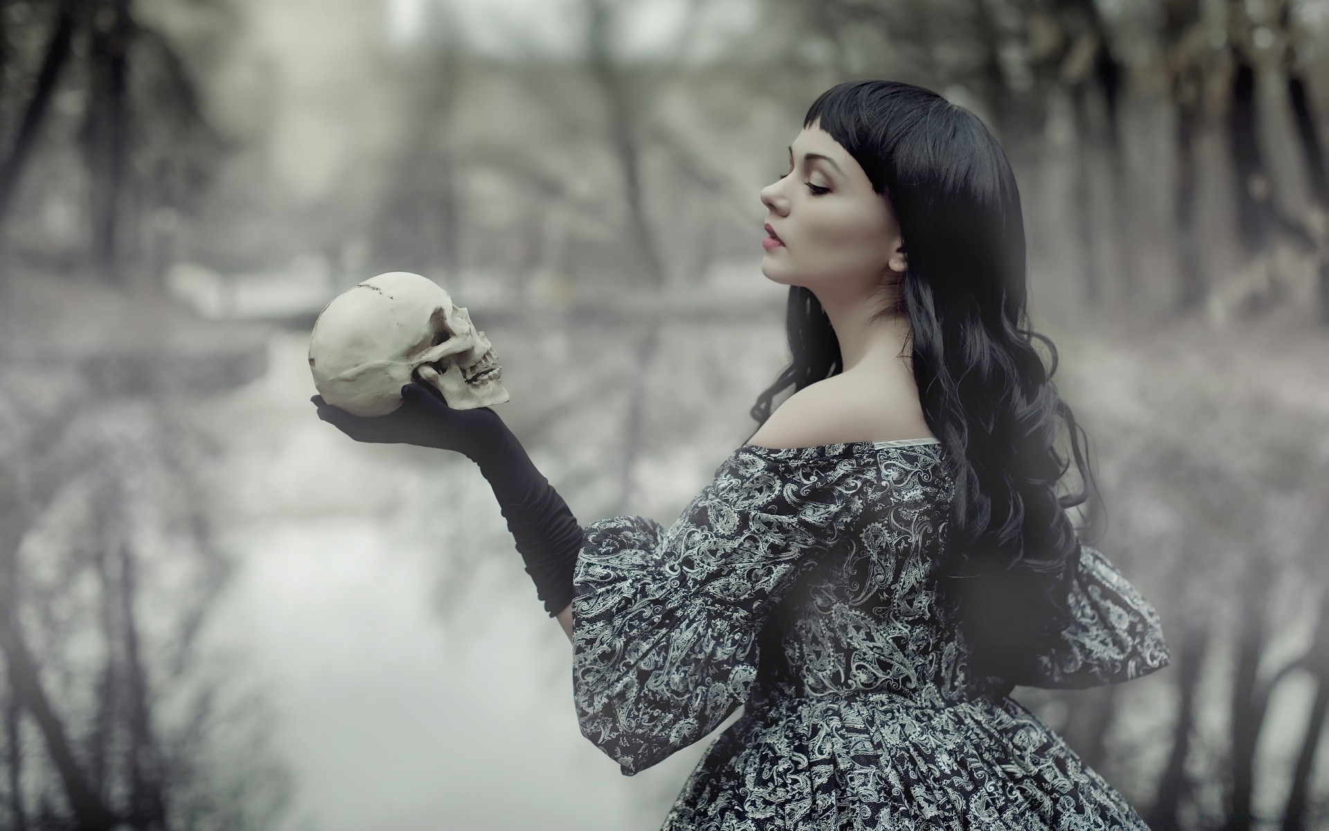 Gotycka dziewczyna trzyma czaszkę w dłoni