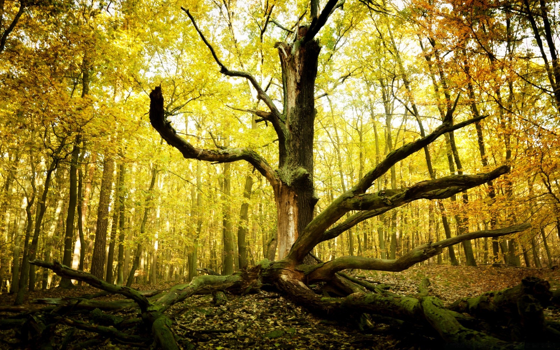 Jesienny krajobraz z uschniętym drzewem rozgałęzionym