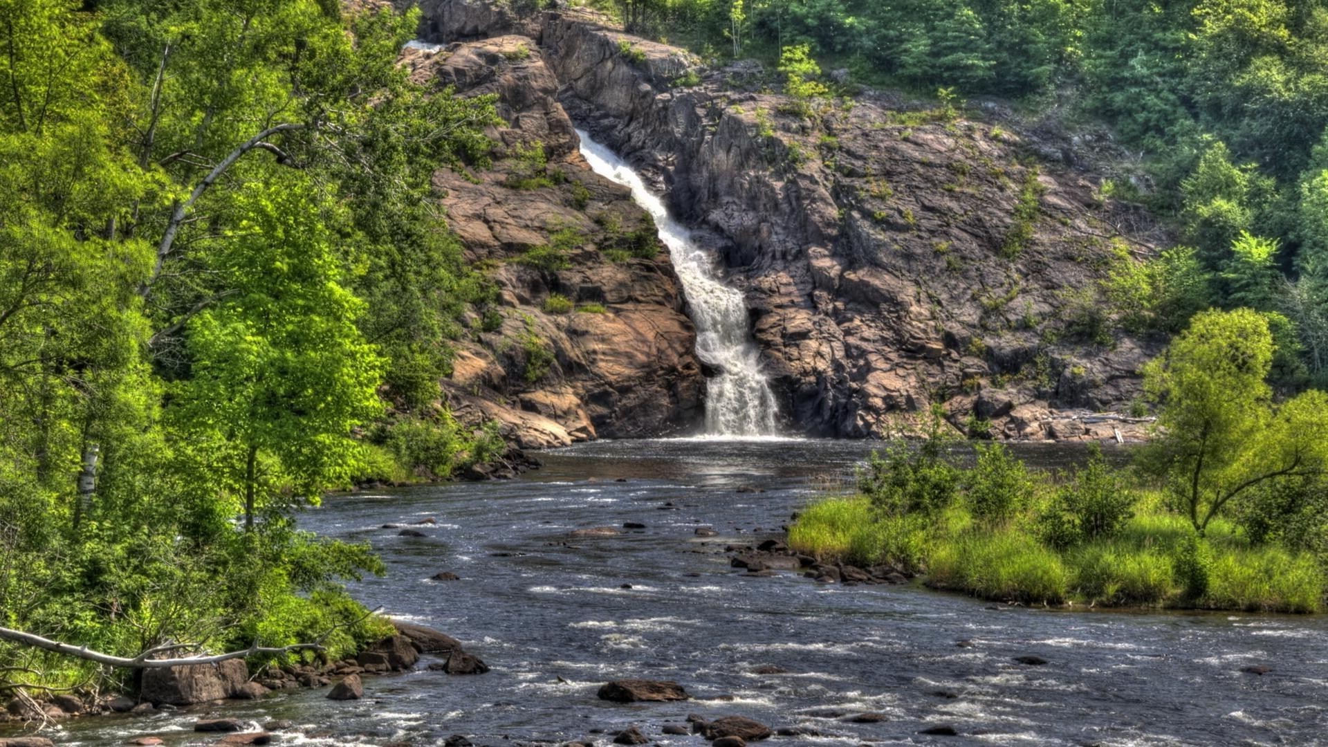 Piękny wodospad pośród bujnego drewna Jets swoje liet